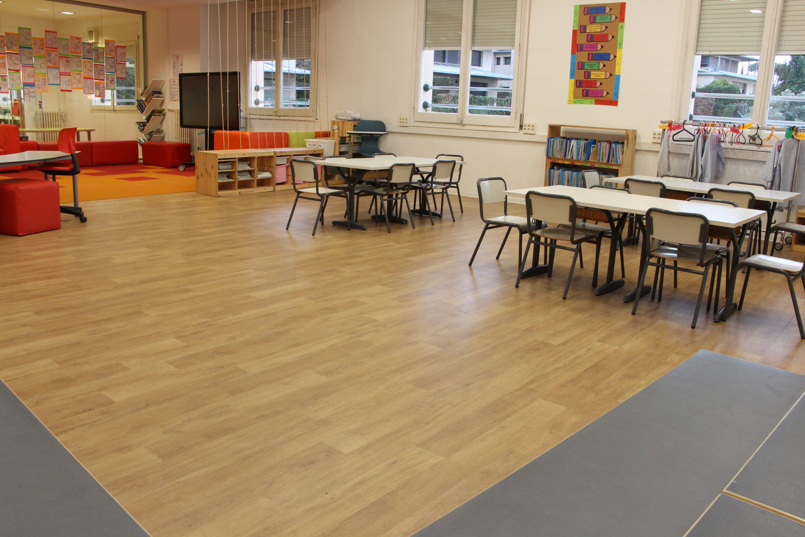 L’escola és una globalitat: tots els espais són educatius, promouen valors i afavoreixen els aprenentatges. L’aula continua essent important , però es dóna també molta importància a altres zones polivalents i comunes on tenen lloc moltes activitats. Es destaca el paper central de l’activitat de l’educador en relació amb l’organització de l’espai i el temps. La distribució de l’espai ha d’afavorir el desenvolupament harmònic dels infants i afavorir la seva autonomia.